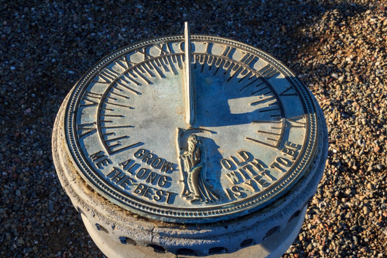 Outside a baby carriage sat on the porch of the cottage, a statue of a boy is given prominence as the centerpiece in a garden, and a sundial tells time nearby.