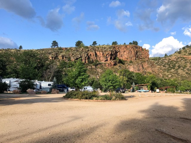 Besides RV sites, the Lyons park offers tent camping with concrete slabs, picnic areas, and playground equipment. Sandstone cliffs and the St. Vrain Creek border the park on three sides. Add in the large shade trees and visitors have a perfect place to escape the heat of a hot summer day.