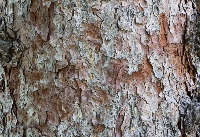 A close-up of bark on a mature Douglas-fir. While the bark on young trees is thin, smooth, gray, and covered with resin blisters, mature trees are about 2-1/4 inches thick and have a cork look to them.