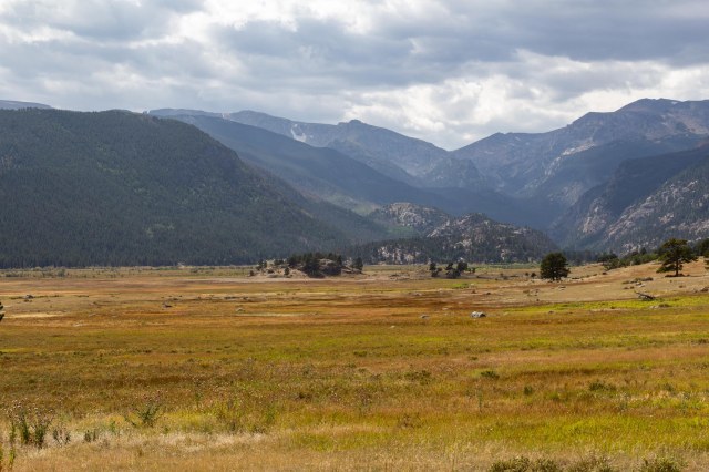 Our final stop was the Discovery Center where they have informative exhibits explaining the geological forces that created the unique terrain and the animals that inhabited the area eons ago. The valley in the photo below sits across the street from the Discovery Center. It’s hard to imagine the valley dotted with lodges, stores, cabins, a golf course, and a post office. When the National Park Service purchased the property in 1962, they removed the structures and the meadows revegetated. Fifty-six years later, there’s no sign of the Historic Moraine Park where visitors once stayed and played.