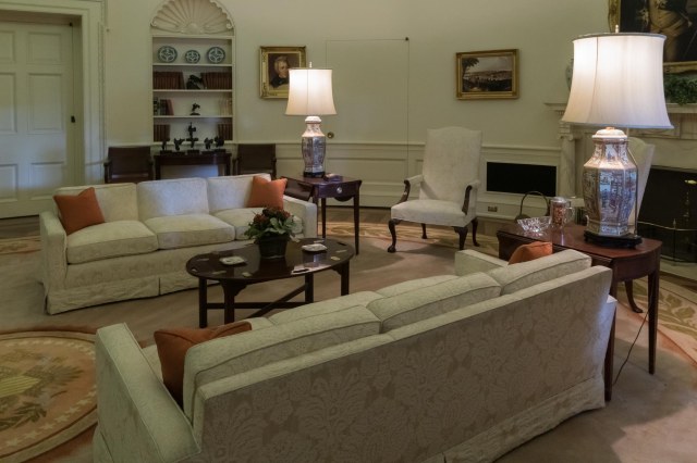 A docent stands inside the Oval Office and tells stories about the president and points out the objects in the room. Only a few people at a time can stand and listen to the docent, and there are no photo opportunities allowed while sitting at the desk.