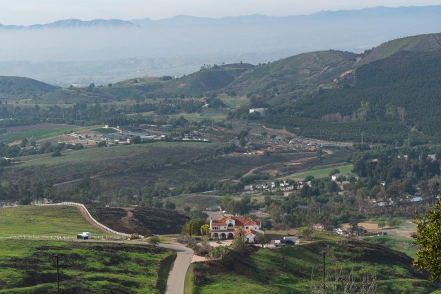 Green shoots popping up through the burn scars below Reagan Presidential Library and Museum