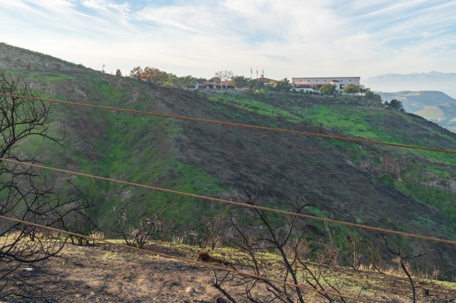Green shoots popping up through the burn scars below Reagan Presidential Library and Museum
