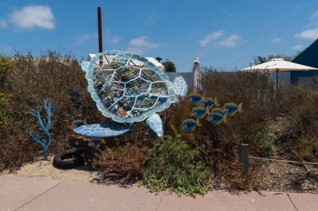 Kevin and Bailey thought they’d seen it all in San Diego County until we found a new place for them to explore. We arrived about an hour after the Living Coast Discovery Center opened and boarded the shuttle that took us to the center. There we found an aquarium with an assortment of sea creatures, aviaries with birds of prey and other birds, a composting display, and various trees and plants. For those who find the San Diego Zoo too large or expensive, they should consider the Discovery Center. The views of Sweetwater Marsh could not be beat, so we ventured along the native pollinator garden and the trail leading out to the bay. My favorite part was the giant sea turtle at the front of the center.