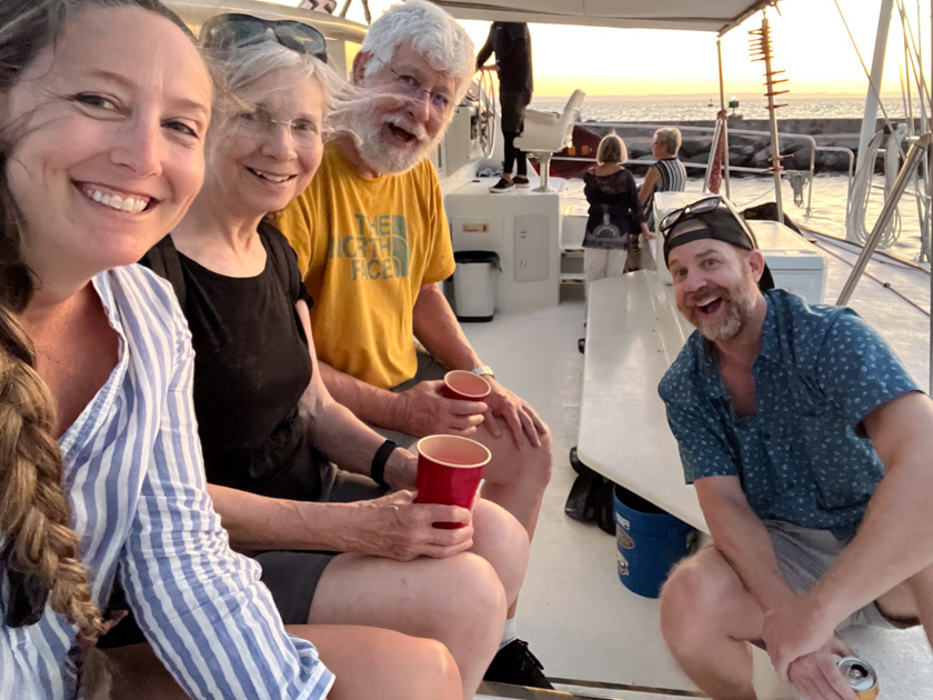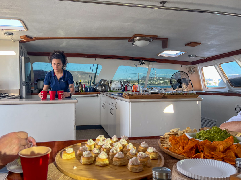 Our 2-1/2 hour catamaran tour of the bay on July 4 took off from the Marina Palmira in front of Captains’ Sunset Bar. Included were Margaritas, rum punch, and other drinks along with plenty of fruit and tasty appetizer bites prepared onboard to enjoy with our drinks, while lively music played through the speakers.
