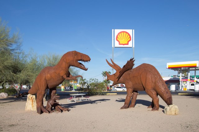On our way out of town on February 24, 2016, we fueled up at the Shell gas station in Gila Bend. While Jon filled up the tank, I snapped a few photos of these fierce-looking dinosaurs.