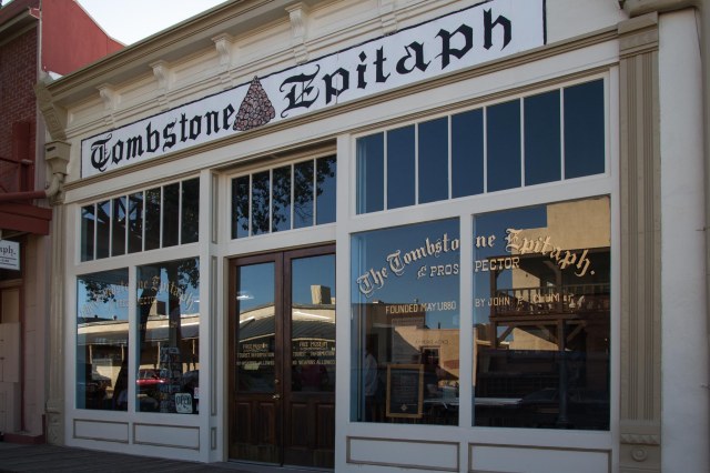 During its eight-year heyday, the Bird Cage Theatre earned its reputation as the wildest, wickedest night spot between New Orleans and San Francisco. Open 24 hours a day, 365 days a year, the building contains over one hundred and forty bullet holes, and a legend says twenty-six people lost their lives there. Hmmm, I wonder if the Tombstone Epitaph has information that will confirm or dispel the legend.