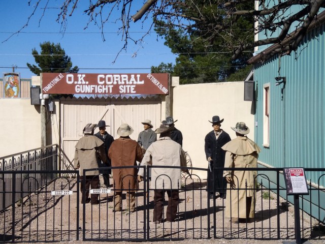 Tombstone, Arizona, is a historic town founded in 1877. It is best known for the OK Corral gunfight on October 26, 1881, with Doc Holliday and the Earp brothers (Wyatt, Virgil, and Morgan) pitted against the Clanton-McLaury gang. The lawmen against the cowboys, or you might say, the Republicans against the Democrats.