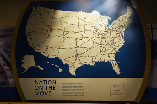The National Interstate and Defence Highways Act (1956) was one of Eisenhower’s notable achievements as president. This display claims, “No public works project comes close to equaling its impact on the country’s economy, security, people, and culture.”