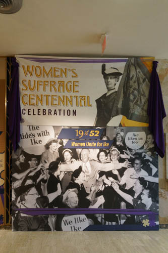 Across from the museum is the library building. During our visit, we found the Women’s Suffrage Centennial exhibit upstairs. It celebrated the women who campaigned for Eisenhower and those who served in his administration. His was the first presidential campaign to focus on the vote of women.