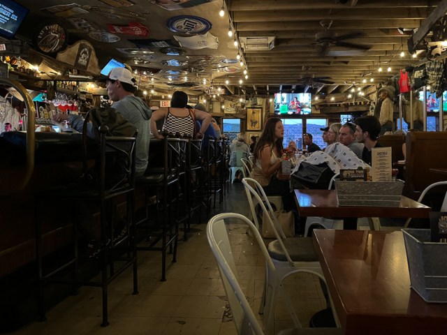 The hidden entrance is around the back, through the patio area. The outside bartender showed us the way. Multiple TVs keep patrons entertained while waiting for their meals, and the corrugated steel panels and antiques contributed to the rustic appeal.